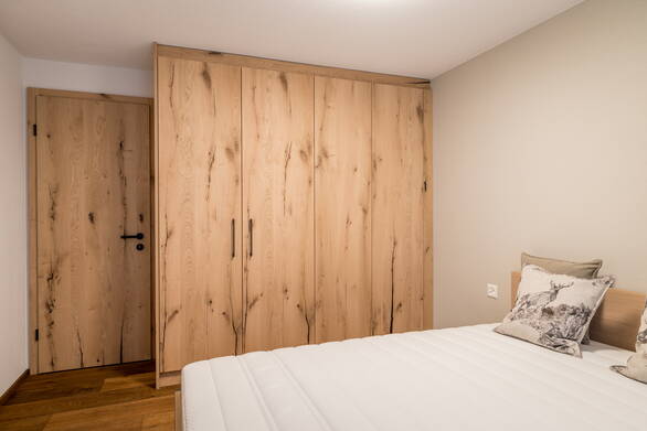 Bei der Sanierung dieser 2.5-Zimmer-Ferienwohnung lag ein besonderes Augenmerk auf der optischen Trennung des Eingangs, der direkt ins Wohnzimmer führt. Realisiert wurde dies durch elegante Holzlamellen und einen praktischen Einbauschrank. Die ehemals abgeschlossene Küche wurde dank integrierter Stahlstützen zum Wohnraum hin geöffnet, was ein grosszügiges, offenes Raumgefühl schafft. Bad und Schlafzimmer sind schlicht und funktional gestaltet, um den Raum optimal zu nutzen.