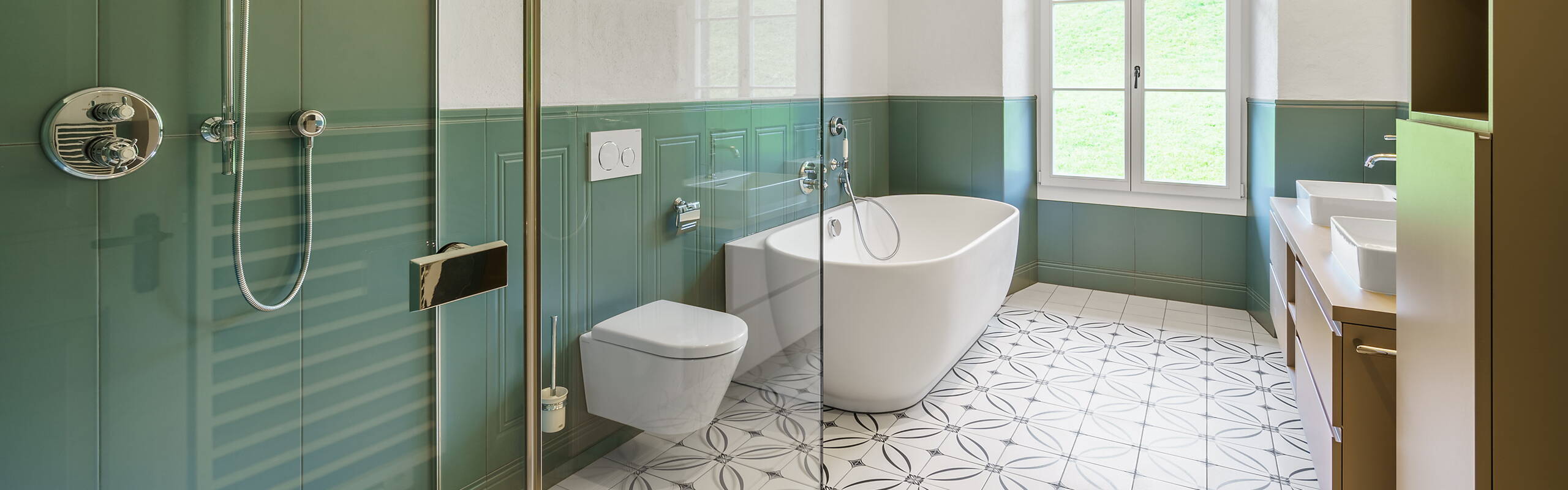 Diese kühle Eleganz wird durch die Farb- und Musterwahl in den Badbereichen und in der neuen Küche unterstrichen.