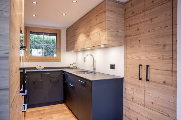 Durch den äusseren Anbau eines Heiz- und Technikraums konnte im Untergeschoss Raum für den Eingangsbereich geschaffen werden. Die kleine Grundfläche des Hauses wird durch die optimale Einteilung der Räume über 3 Etagen ideal ausgenutzt. Eine grosse Hebeschiebetüre zum Gartensitzplatz erweitert den Wohnbereich. Die harmonische Einrichtung verleiht dem Einfamilienhaus seinen familiären, wohligen Charakter.